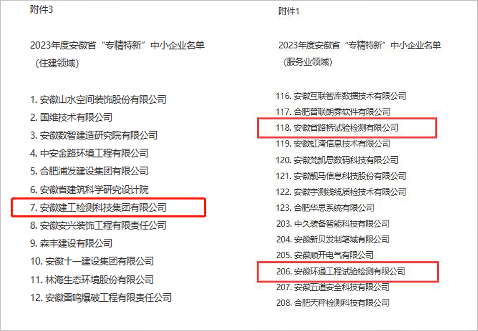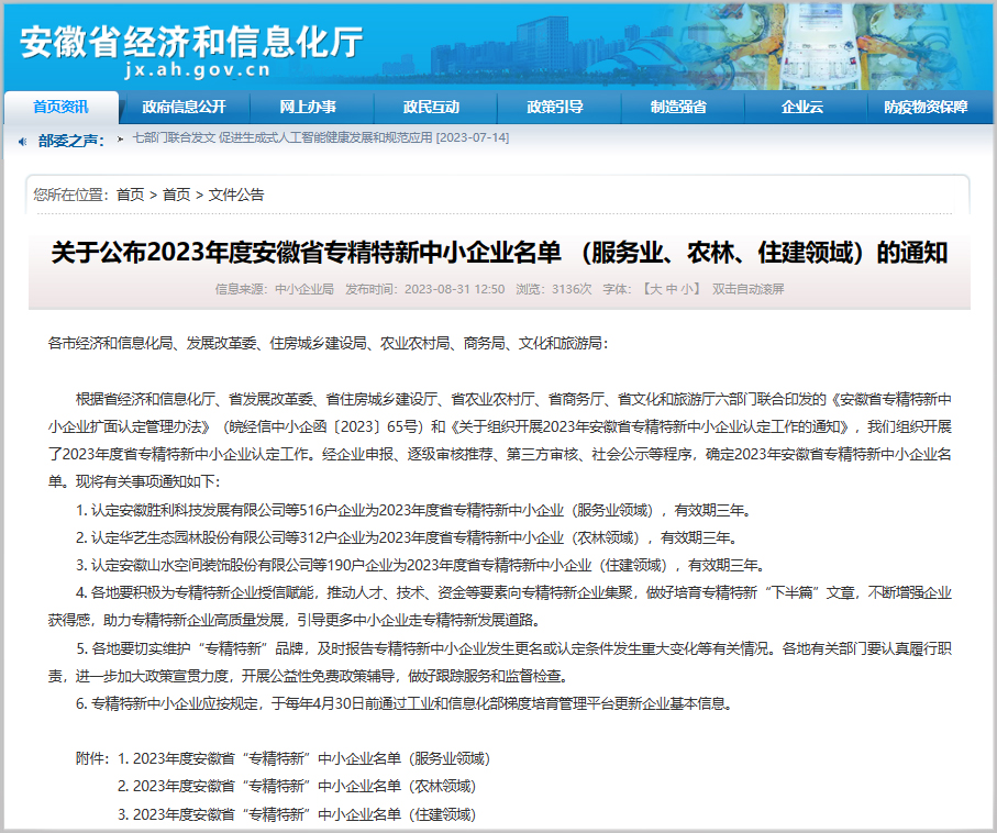 近日,安徽省經信廳公布了2023年度安徽省“專精特新”中小企業(yè)名單,建工檢測及所屬兩家子公司(路橋檢測、環(huán)通檢測)經企業(yè)申報、逐級審核推薦、第三方審核等程序,成功入選2023年度安徽省“專精特新”中小企業(yè)!
