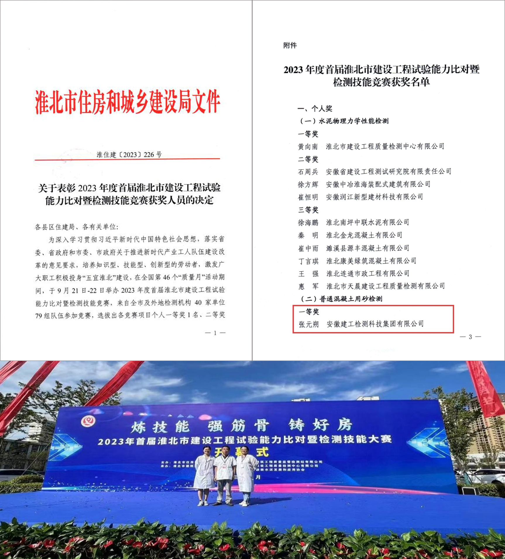 喜訊!建工檢測員工榮獲首屆淮北市建設工程試驗能力比對暨檢測技能競賽個人一等獎