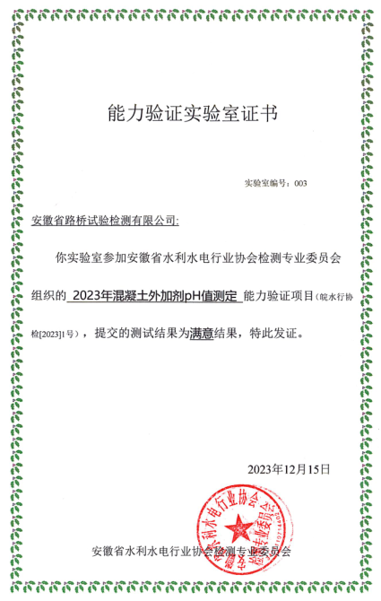 近日,建工檢測(cè)路橋試驗(yàn)檢測(cè)有限公司收到安徽省水利水電行業(yè)協(xié)會(huì)檢測(cè)專業(yè)委員會(huì)頒發(fā)的《能力驗(yàn)證實(shí)驗(yàn)室證書》,路橋檢測(cè)公司在“2023年混凝土外加劑pH值測(cè)定”能力驗(yàn)證結(jié)果為“滿意”,展現(xiàn)了路橋檢測(cè)公司試驗(yàn)檢測(cè)人員操作規(guī)范、試驗(yàn)數(shù)據(jù)真實(shí)準(zhǔn)確的技術(shù)水平和工作質(zhì)量。