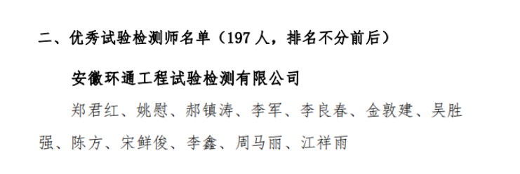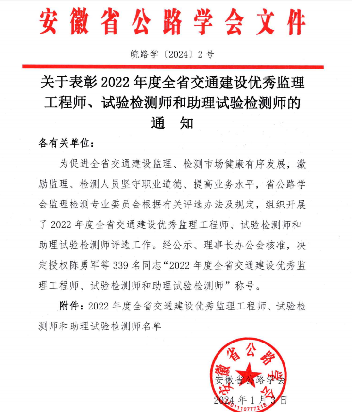 近日,安徽省公路學(xué)會(huì)公布了“2022年度全省交通建設(shè)優(yōu)秀監(jiān)理工程師、試驗(yàn)檢測(cè)師和助理試驗(yàn)檢測(cè)師名單”,建工檢測(cè)環(huán)通公司鄭君紅等12名同志榮獲“優(yōu)秀試驗(yàn)檢測(cè)師”榮譽(yù)稱號(hào),姚金地等2名同志榮獲“優(yōu)秀助理試驗(yàn)檢測(cè)師”榮譽(yù)稱號(hào)。