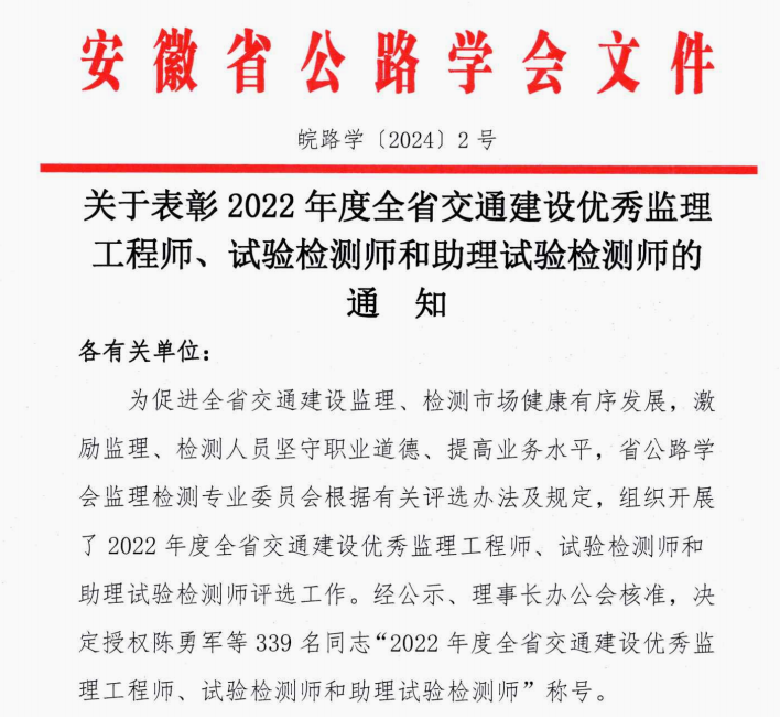 喜訊!建工檢測(cè)路港通公司員工榮獲2022年度全省交通建設(shè)“十佳檢測(cè)工程師”“優(yōu)秀試驗(yàn)檢測(cè)師”稱號(hào)