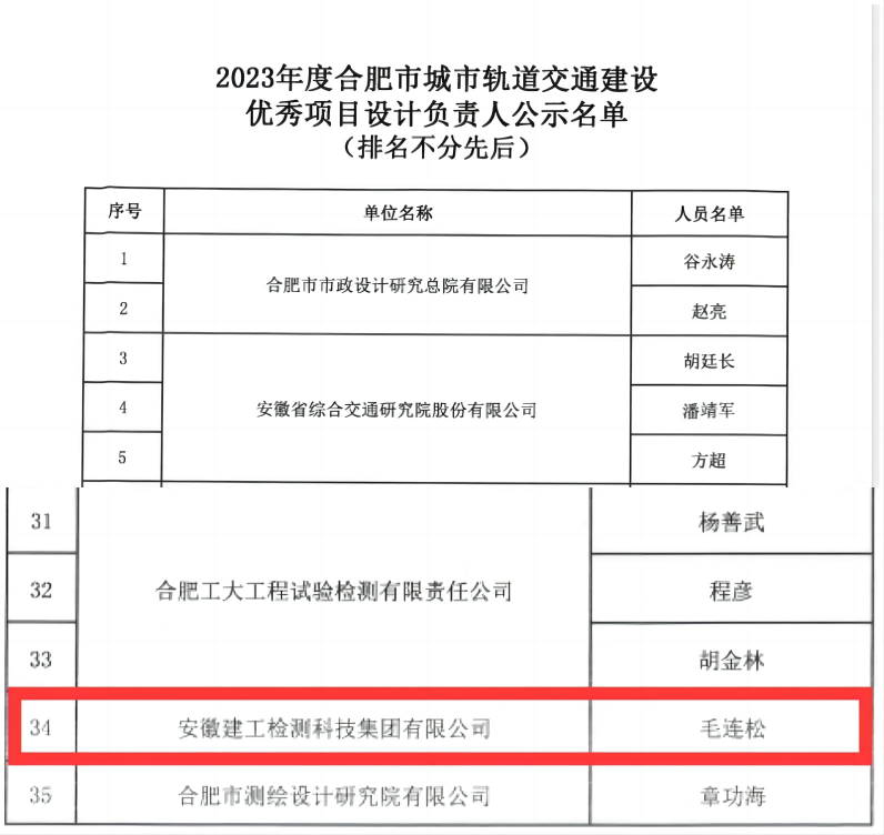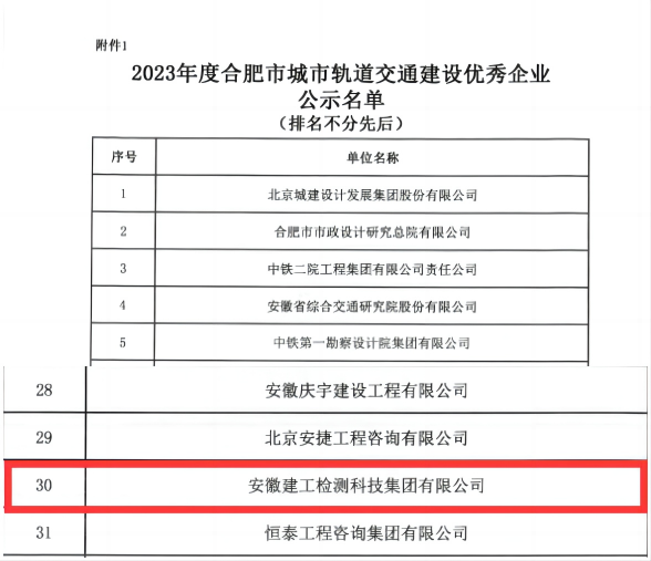 近日,合肥市城市軌道交通協(xié)會下發(fā)《關(guān)于表彰2023年度合肥市城市軌道交通建設(shè)的優(yōu)秀企業(yè)和優(yōu)秀項目經(jīng)理名單的通知》文件,安徽建工檢測科技集團(tuán)有限公司被授予“優(yōu)秀企業(yè)”稱號,毛連松同志榮獲“優(yōu)秀項目經(jīng)理”榮譽稱號。這是建工檢測第三次獲此“優(yōu)秀企業(yè)”榮譽稱號。