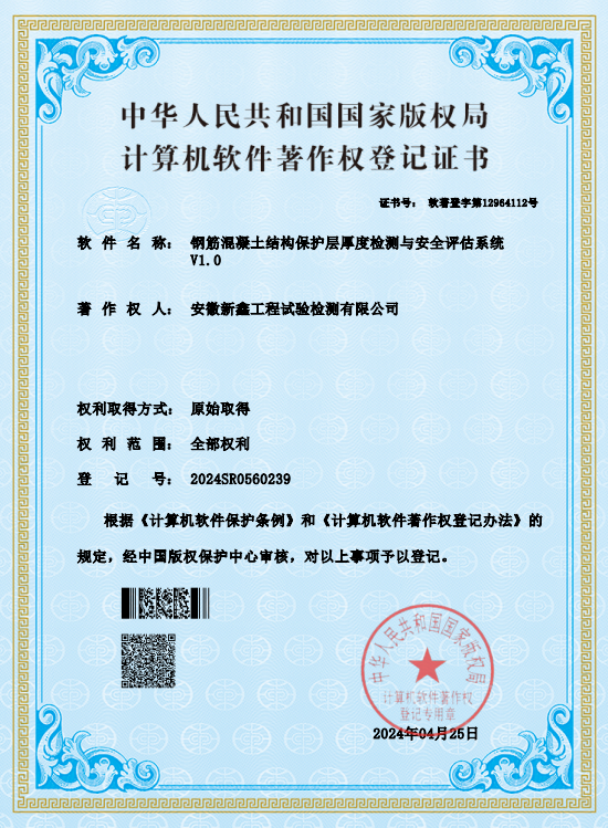 近日,安徽新鑫工程試驗(yàn)檢測有限公司成功獲得5項(xiàng)軟件著作權(quán):工程管道CCTV檢測機(jī)器人線纜收放張力自適應(yīng)控制系統(tǒng)、道路連接結(jié)構(gòu)部件穩(wěn)固性檢測系統(tǒng)、鋼筋混凝土結(jié)構(gòu)保護(hù)層厚度檢測與安全評估系統(tǒng)、工程檢測吊錘穩(wěn)定性校準(zhǔn)檢測系統(tǒng)、混凝土摻合料抗剪切力安全檢測與管理系統(tǒng)。