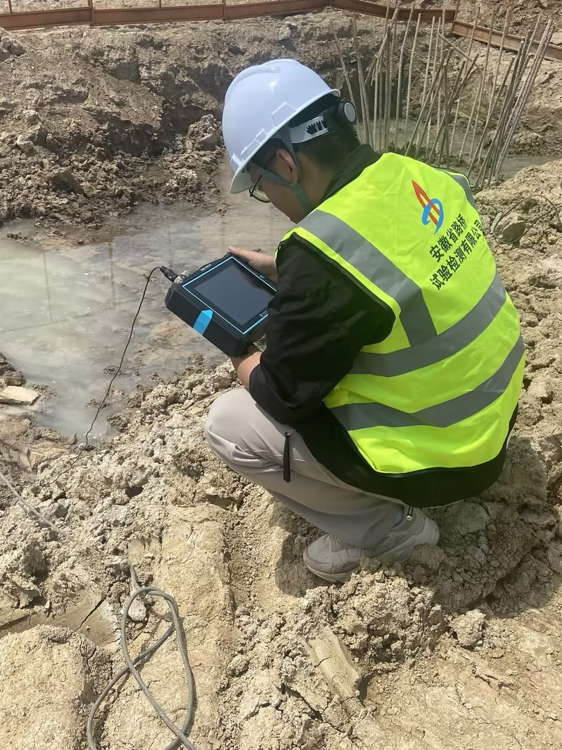 萬海超,路橋檢測結(jié)構(gòu)檢測研究所助理檢測師,榮獲2023年度建工檢測“優(yōu)秀共青團(tuán)員”稱號,正在使用基樁低應(yīng)變檢測儀進(jìn)行樁頂施加低能量沖擊荷載試驗(yàn),實(shí)測被檢樁加速度(或速度)響應(yīng)時(shí)程曲線,運(yùn)用一維線彈性波動(dòng)理論的時(shí)域和頻域分析,對被檢樁的樁身完整性進(jìn)行評判,其目的是檢測樁身缺陷及位置,評判樁身完整性。