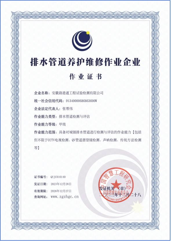 近日,安徽路港通工程試驗檢測有限公司正式取得城鎮(zhèn)排水管道更新與非開挖修復(fù)和排水管道檢測與評估兩項作業(yè)能力甲級證書。