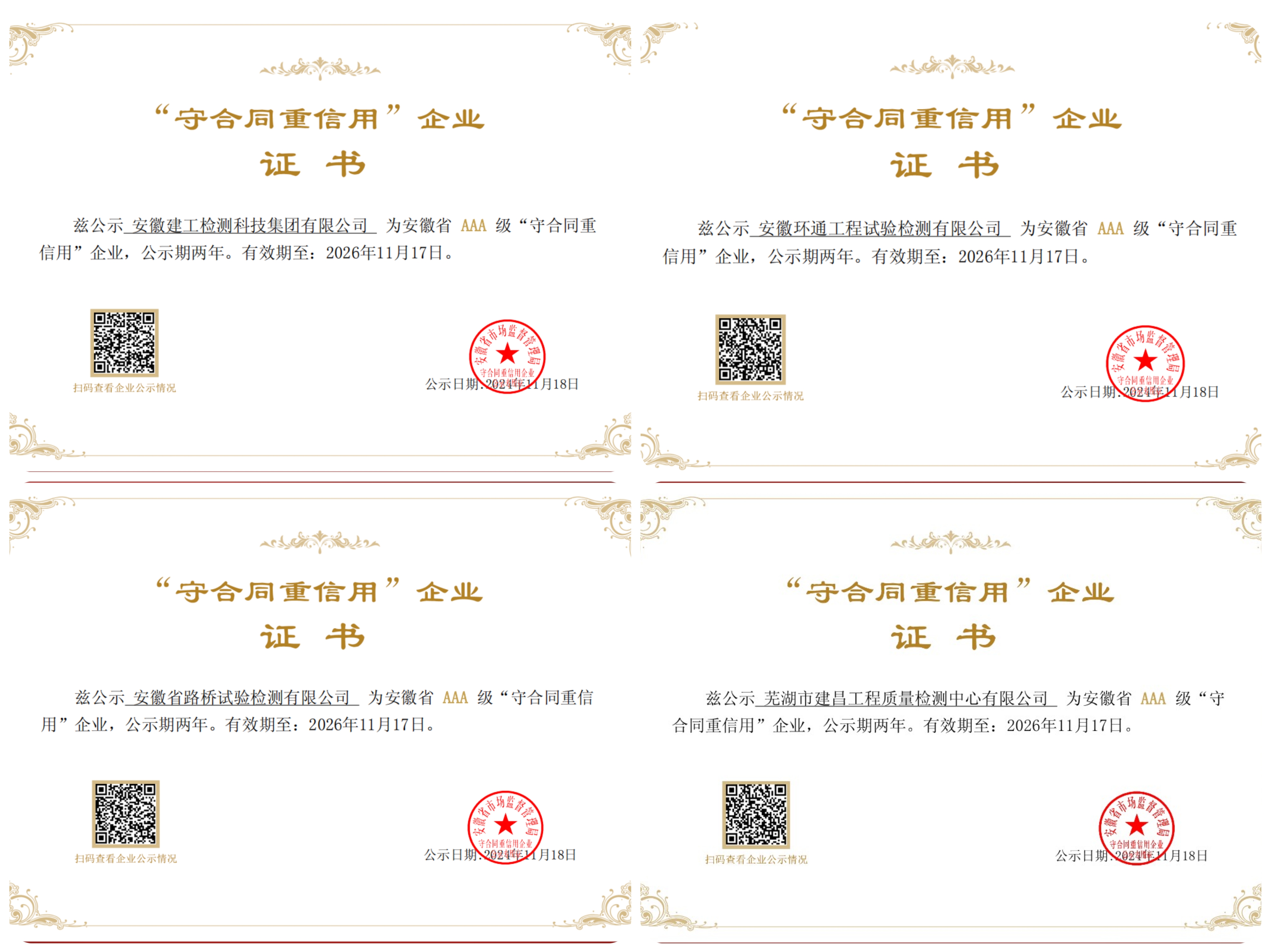 近日,在安徽省市場監(jiān)督管理局開展的2022-2023年度“安徽省守合同重信用”AAA級企業(yè)評級中,我司及所屬子公司安徽省路橋試驗(yàn)檢測有限公司、安徽環(huán)通工程試驗(yàn)檢測有限公司、蕪湖市建昌工程質(zhì)量檢測中心有限公司同時獲評2022-2023年度“安徽省守合同重信用”AAA級企業(yè)。