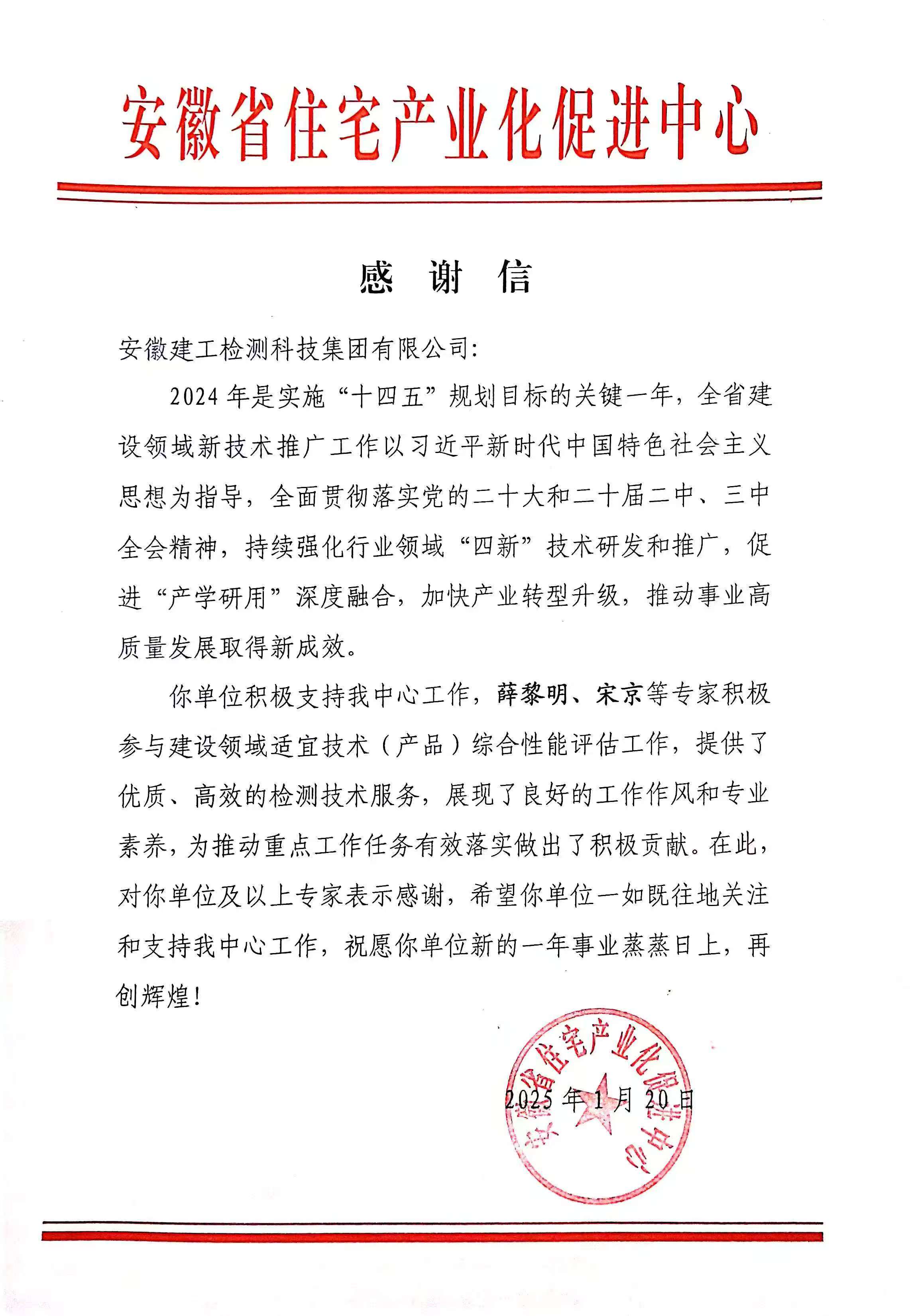 近日,建工檢測收到了安徽省住宅產(chǎn)業(yè)化促進(jìn)中心發(fā)來的感謝信。信中對建工檢測及所屬職工薛黎明、宋京等積極支持并參與建設(shè)領(lǐng)域適宜技術(shù)(產(chǎn)品)綜合性能評估工作,為推動重點工作任務(wù)有效落實做出的積極貢獻(xiàn),給予了充分肯定和衷心感謝。