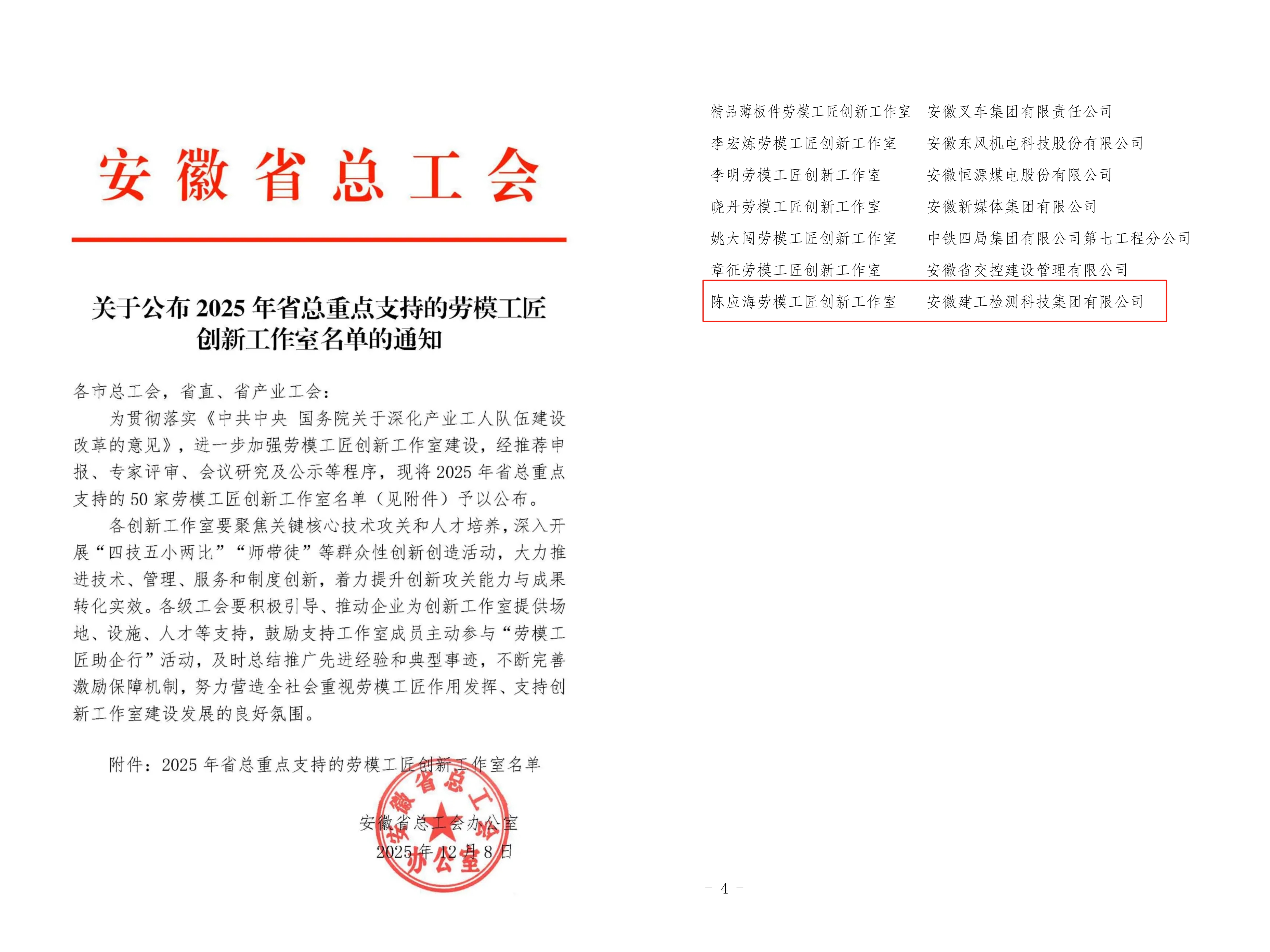 喜報(bào)!公司“陳應(yīng)海勞模工匠創(chuàng)新工作室”獲評(píng)2025年安徽省總工會(huì)重點(diǎn)支持勞模工匠創(chuàng)新工作室