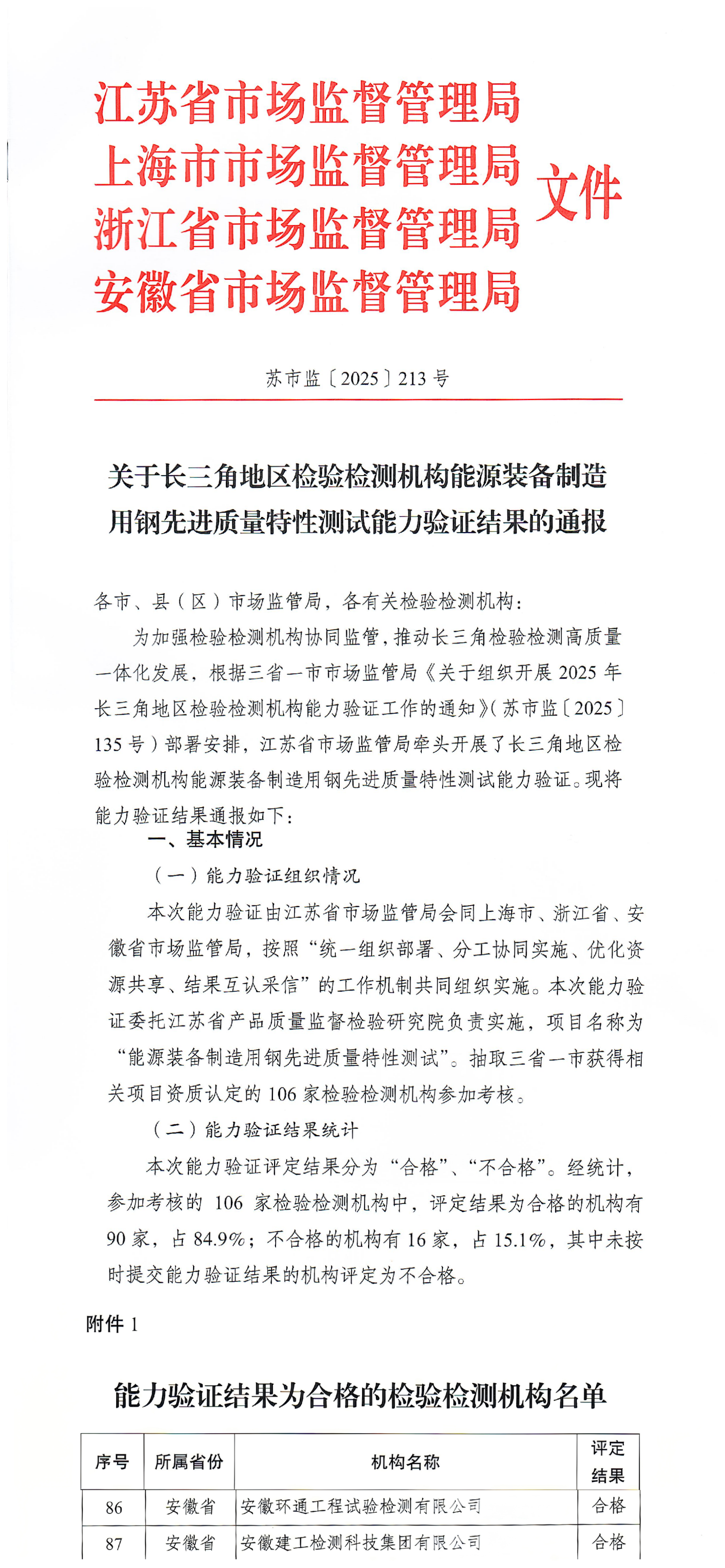 近日,長(zhǎng)三角三省一市市場(chǎng)監(jiān)督管理局、安徽省市場(chǎng)監(jiān)督管理局先后通報(bào)了2025年度檢驗(yàn)檢測(cè)機(jī)構(gòu)能力驗(yàn)證結(jié)果。建工檢測(cè)公司本部、淮南分場(chǎng)所及所屬環(huán)通檢測(cè)、建昌檢測(cè)在上述各項(xiàng)能力驗(yàn)證中結(jié)果均為“合格”。