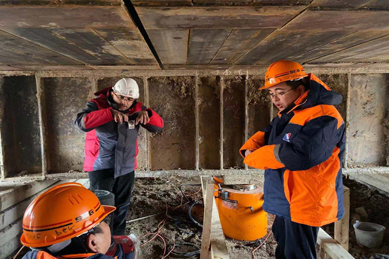 二站巖土分院作為承接單位,對該項目高度重視,前期與上海建工就技術(shù)問題進行了充分溝通,制定了全面而細致的檢測方案,在當(dāng)?shù)刂谱髁虽摿骸⑴渲氐却笮驮O(shè)備,以確保檢測現(xiàn)場能夠順利實施,同時于2019年12月外派強光玉、陳明兩位優(yōu)秀項目經(jīng)理長駐現(xiàn)場提供專業(yè)檢測服務(wù)。同志們克服氣候嚴(yán)寒、語言不通、水土不服的困難,不僅順利啟動了檢測工作,而且一個月內(nèi)完成了總工作量的50%,給總包單位節(jié)約了工期,以嚴(yán)謹(jǐn)?shù)墓ぷ髯黠L(fēng)和優(yōu)質(zhì)的服務(wù)展現(xiàn)了安徽建科質(zhì)檢二站的風(fēng)采,得到了現(xiàn)場各方主體單位的一致好評,樹立了安徽建科人敬業(yè)奉獻、艱苦奮斗的良好職業(yè)形象。