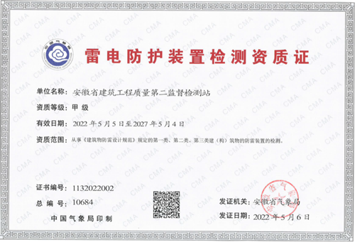 5月6日,根據(jù)安徽省氣象局批準(zhǔn)認(rèn)定,省質(zhì)檢二站榮升雷電防護(hù)裝置檢測甲級資質(zhì)。本次資質(zhì)升級認(rèn)可批準(zhǔn)通過標(biāo)志著二站已具備從事《建筑物防雷設(shè)計(jì)規(guī)范》規(guī)定的第一類、第二類、第三類建(構(gòu))筑物防雷裝置的檢測能力。