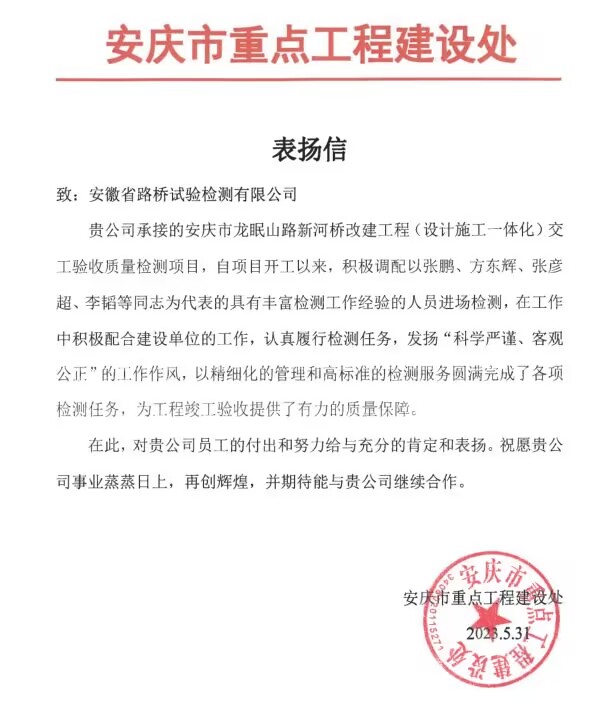 近日,安徽省路橋試驗(yàn)檢測(cè)有限公司收到安慶市重點(diǎn)工程建設(shè)處表揚(yáng)信。贊揚(yáng)檢測(cè)公司自承接安慶市龍眠山路新河橋改建工程(設(shè)計(jì)施工一體化)交工驗(yàn)收質(zhì)量檢測(cè)項(xiàng)目以來,團(tuán)隊(duì)高效率完成各項(xiàng)任務(wù),給予通報(bào)表揚(yáng)。